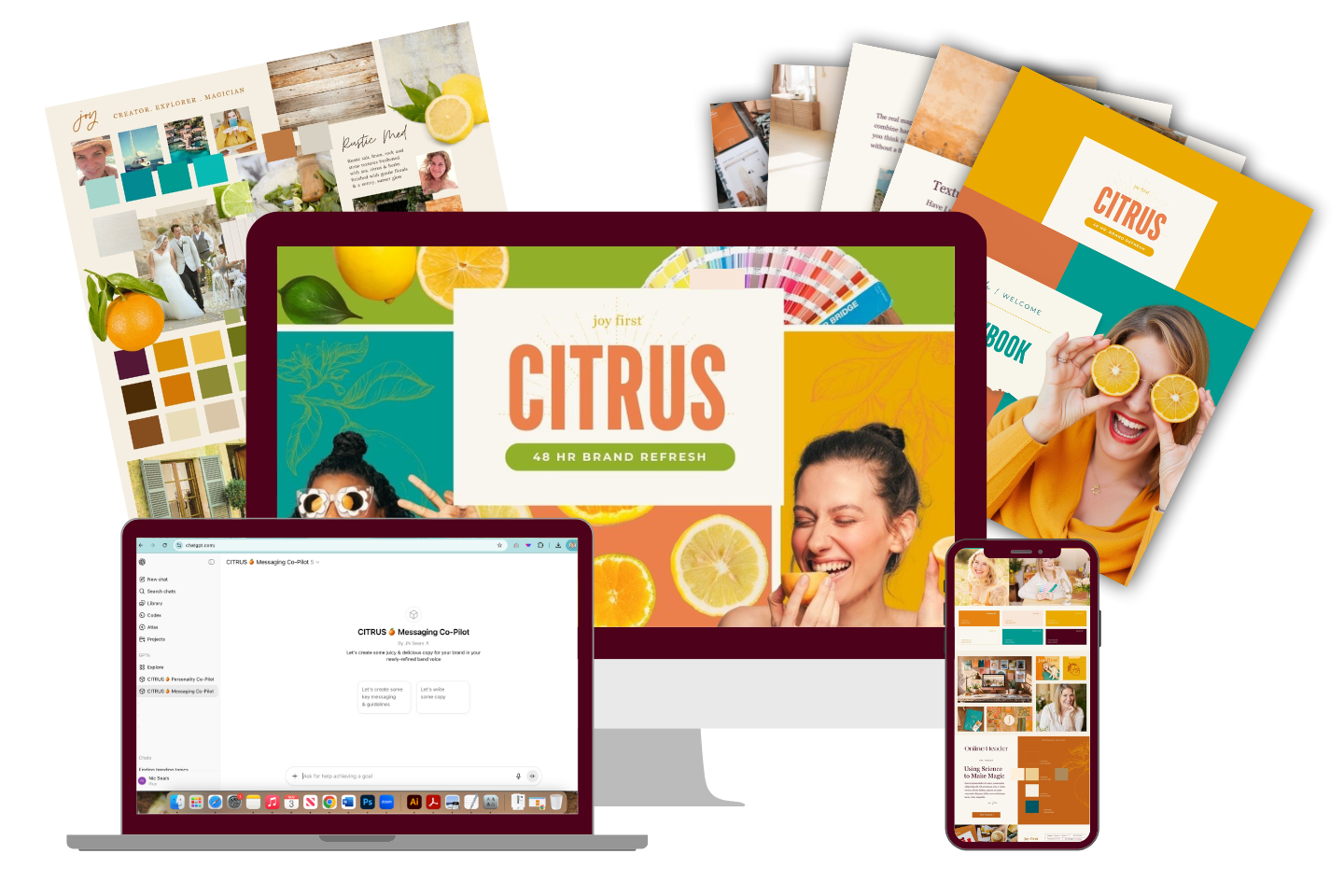 CITRUS is a self-led brand refresh program focused on updating your positioning, messaging, clarity, colors, fonts, logo and rolling it out on your website and social presence... all in one weekend. It's DIY with expert guidance and ai co-pilots trained in my methodologies. It is best for new or established businesses that are in the 'chicken and egg' position of needing a better brand to help them grow, but not having a lot of money to spend on it right now (because their business needs to grow!) .